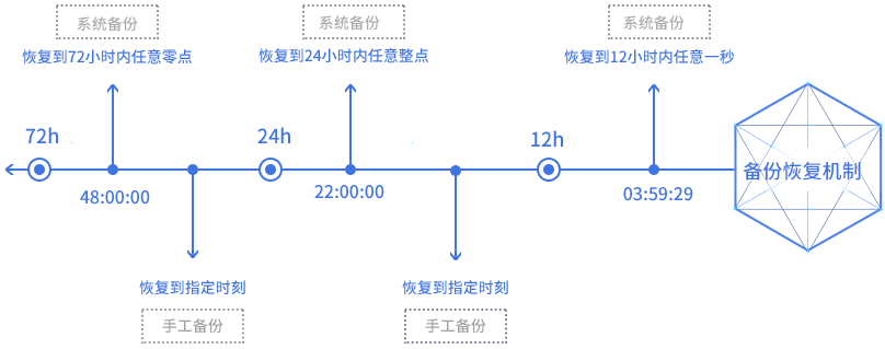 支持12小時內恢復任一秒,24小時內任意整點時刻數據恢復,盡可能的避免數據丟失。